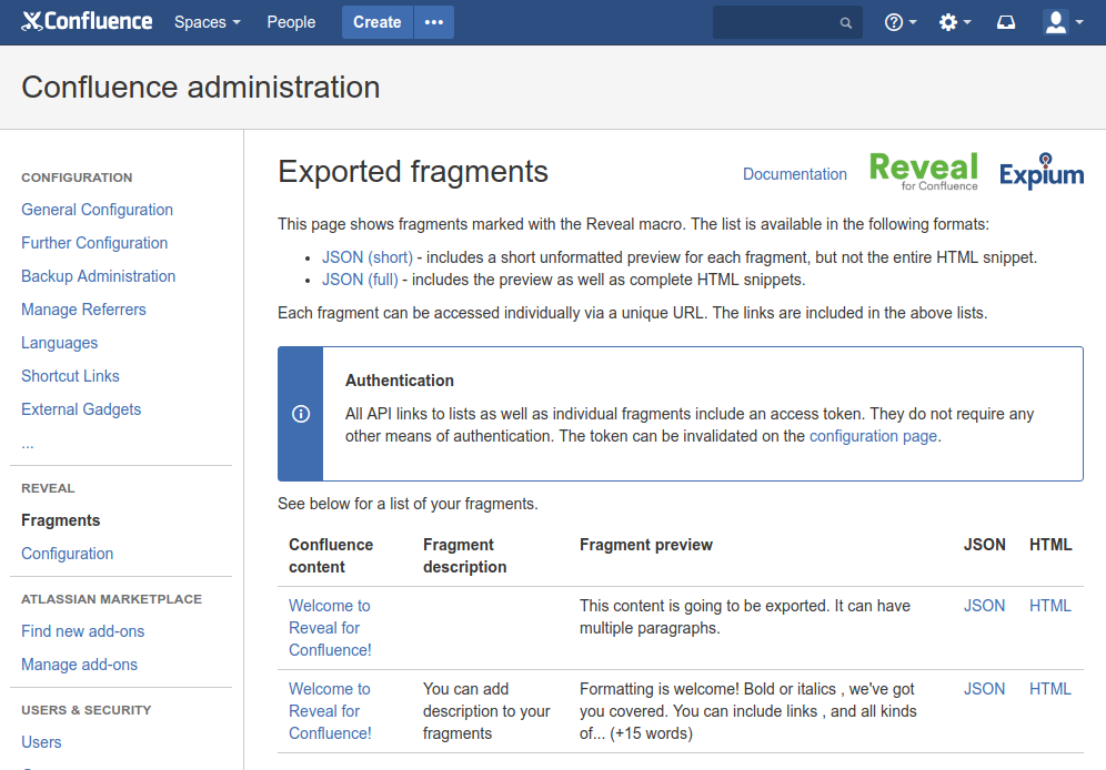 Next, go to Confluence administration to obtain the URLs for your fragments.