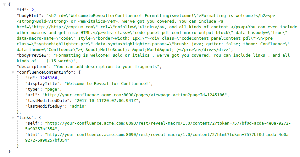 JSON list of all the fragments from all pages. These include meta information about the confluence content containing the fragment, short unformatted preview for each fragment, as well as complete, ready-to-use HTML rendering.